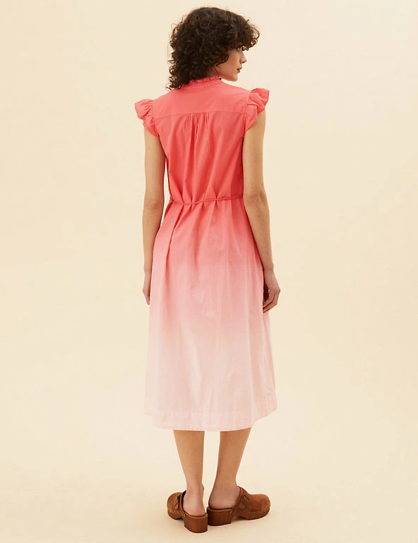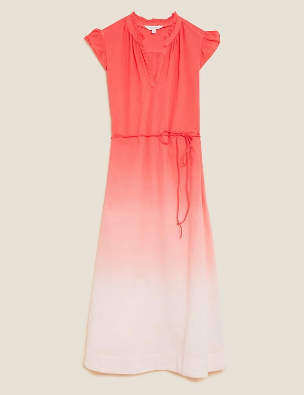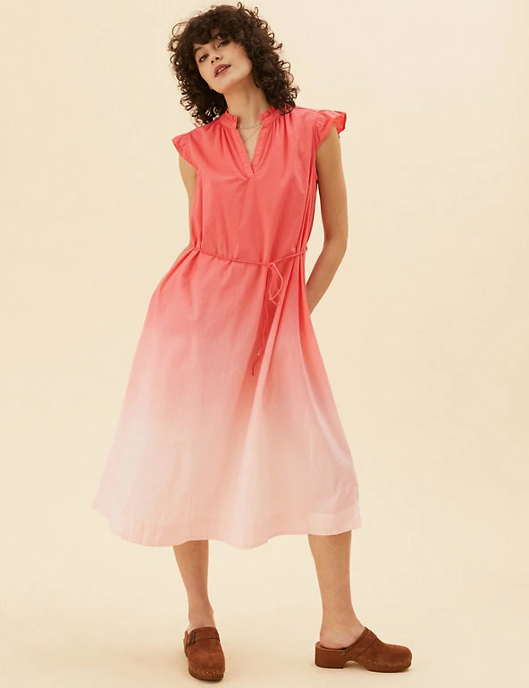 Step out into the sunshine with this pure cotton dip-dye dress from our Per Una range. It’s cut to a comfortable regular fit, with a classic v-neckline and a detachable tie-waist belt to highlight your figure. The sleeveless design is perfect for warm weather, and frilled detailing on the shoulders adds a feminine flourish. This piece falls to an elegant midi length with flattering tiers. All of the cotton for our clothing is sustainably sourced and always will be. Per Una: stylish designs crafted with carefully considered details and feminine flourishes.