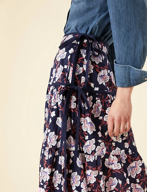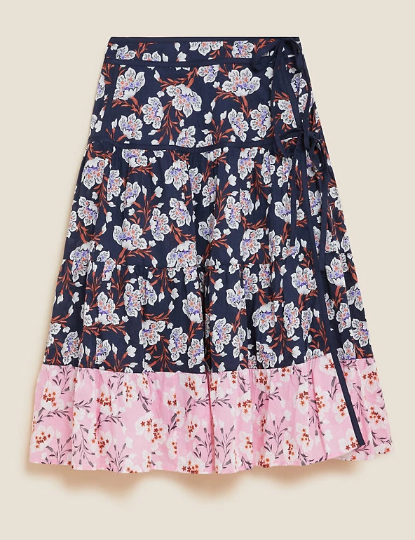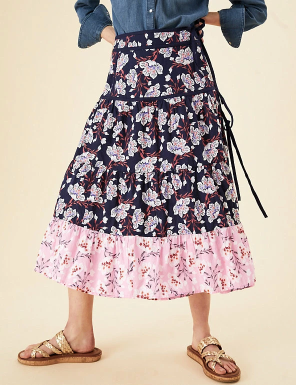Mix up your florals with this pure cotton skirt from our Per Una range. Cut to a midi length, the wrap-style design features a tie at the side, while a button sits on the inside for a secure fit. Two contrasting floral prints create a standout look, while ruffles and tiers bring boho-style charm. The skirt is finished with neat binding detail. We only ever use responsibly sourced cotton for our clothes.