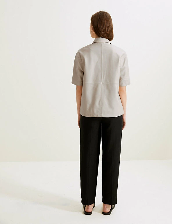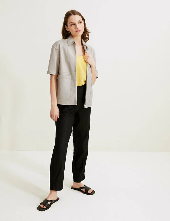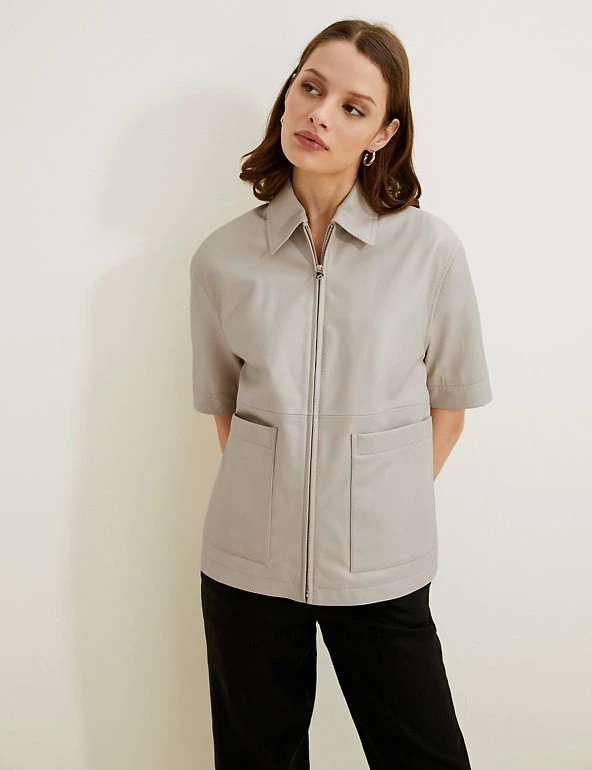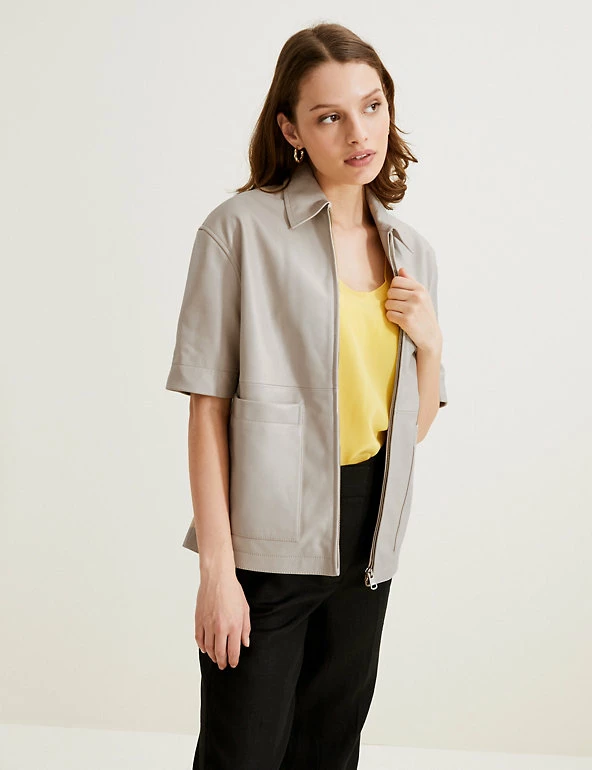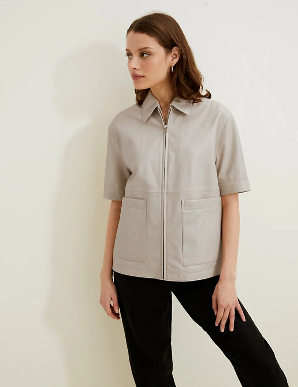 Regular fit, Zip fastening, Lined, Collared neck, Short sleeve, Exterior pocket, Responsibly sourced leather