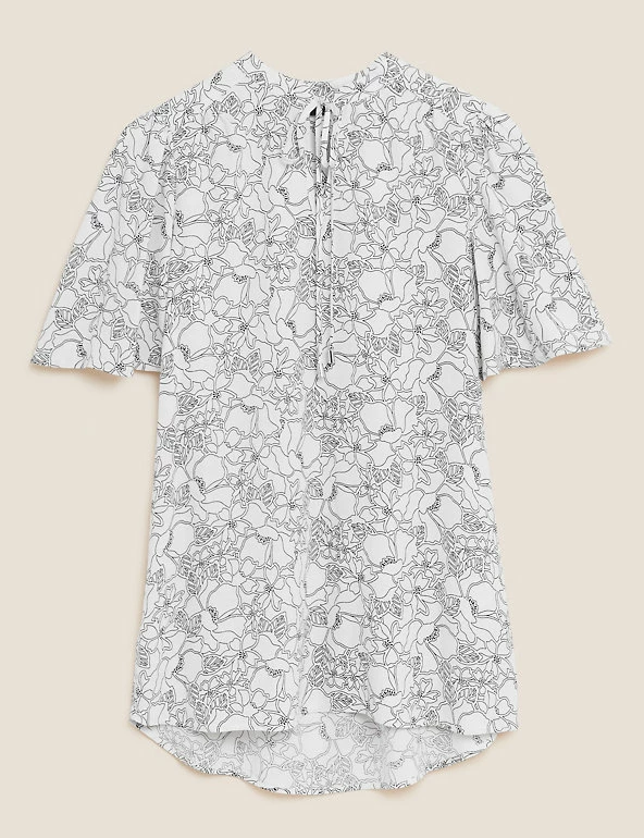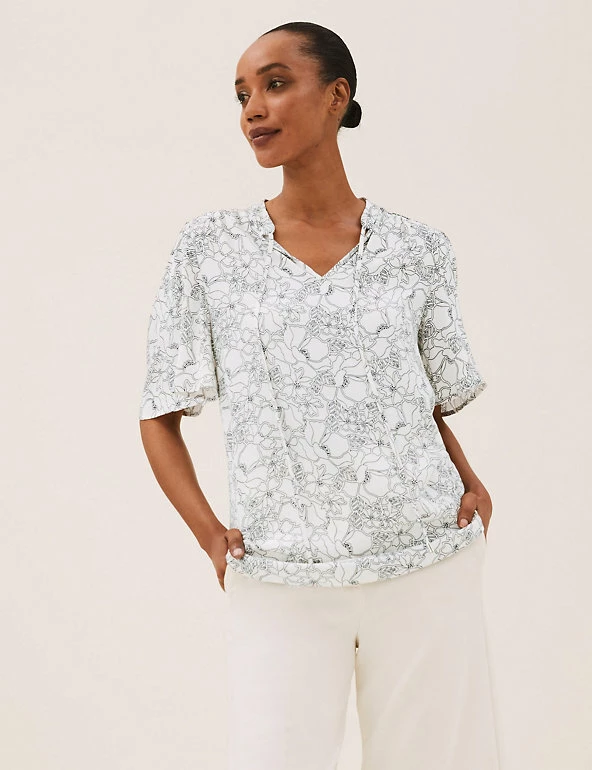 Short sleeves and a neat tie neck give this popover blouse an elegant feel. It’s designed in a regular fit, with a sophisticated v-neck and a floral print for an extra flourish.