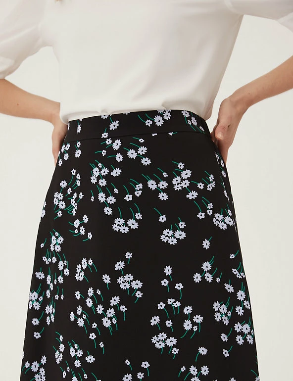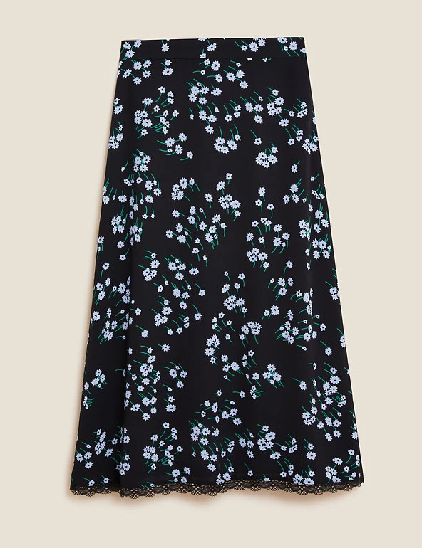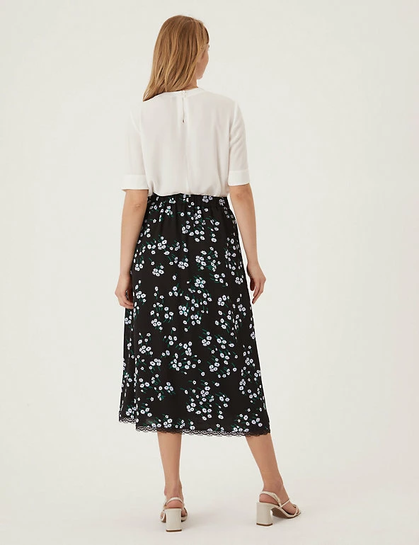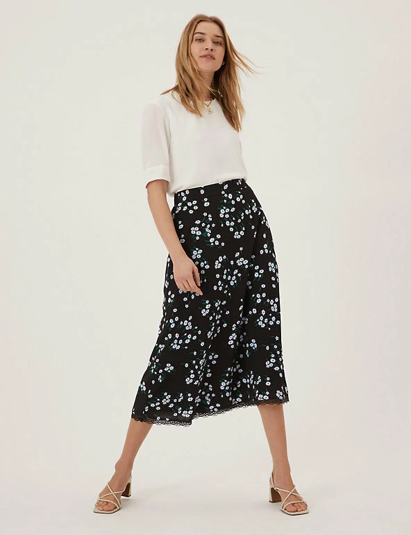 Equal parts comfortable and twirl-worthy, this floral skirt is one for your party wardrobe. The chic A-line piece drops to a midi length and is fully lined. An elasticated waist provides a custom fit, while added stretch in the fabric allows for extra ease of movement. Delicate lace trimming along the hem completes the look.