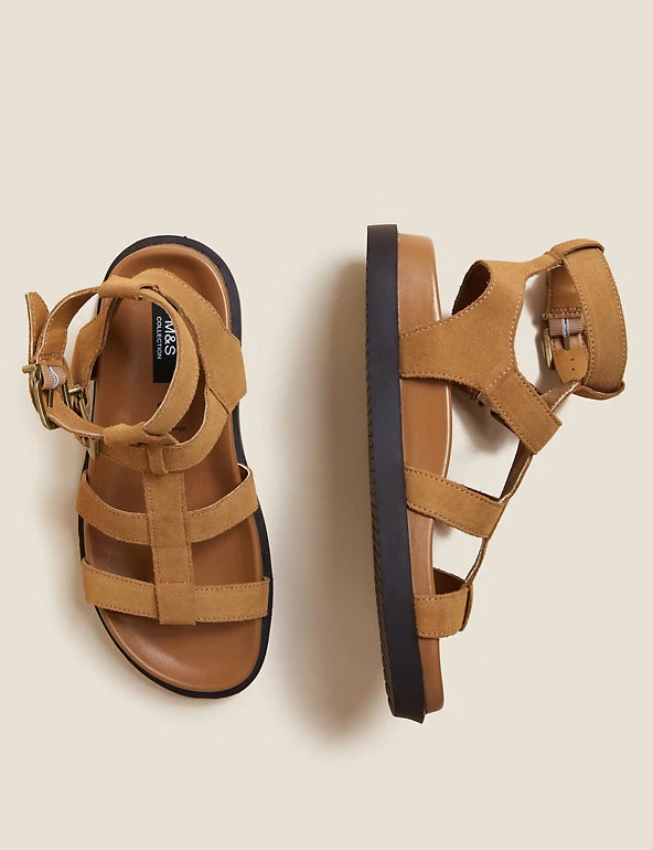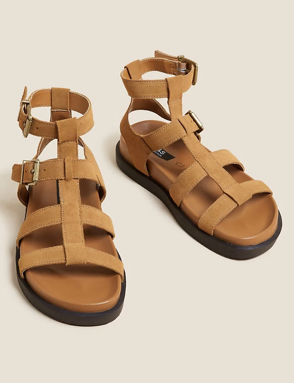 Step into summer with these suede gladiator sandals. They’re designed with a flat espadrille heel and double buckle fastening at the ankle for comfort. The supple cage-effect straps are coated with stain-resistant technology to keep them looking newer for longer.