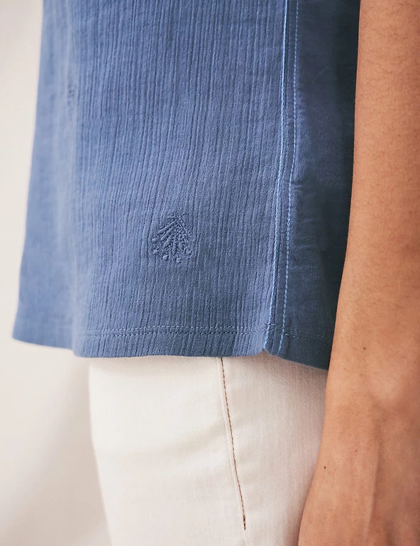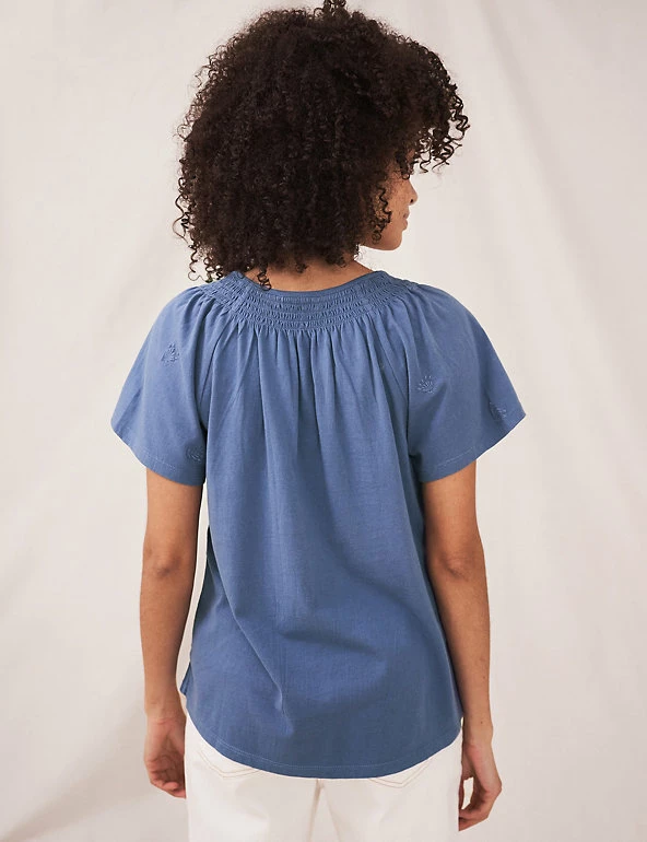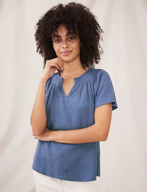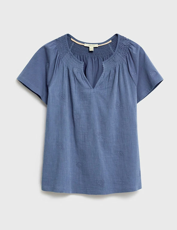 This pure-cotton top by White Stuff is full of dainty details. Cut to a regular fit, it features an elegant notch neckline and short sleeves. Shirring creates subtle drape through the body. Botanical-inspired embroidery completes this summer-ready style.
