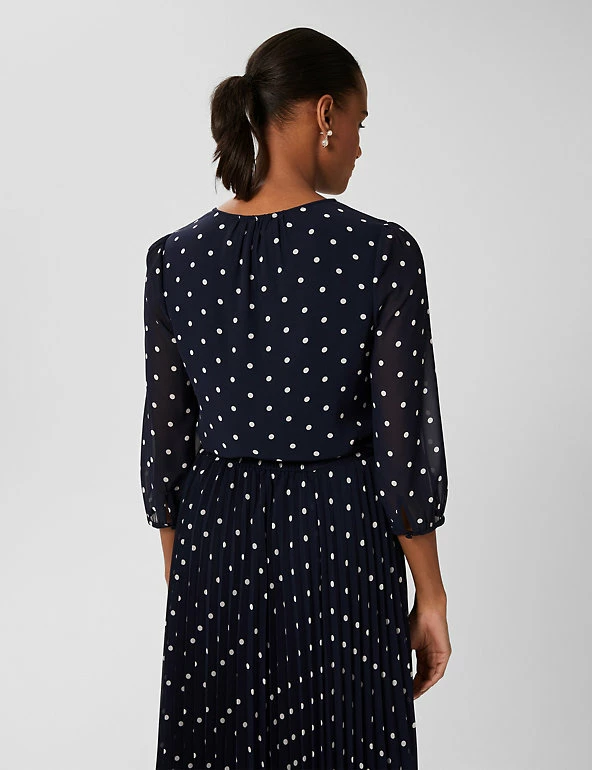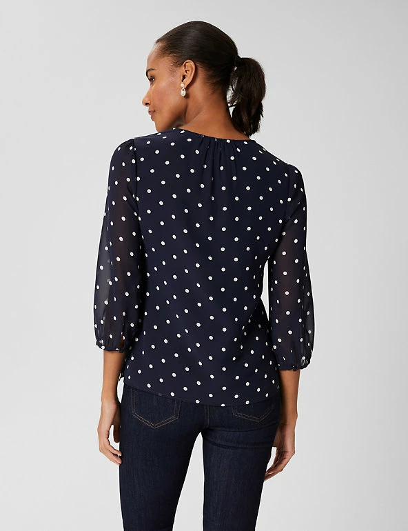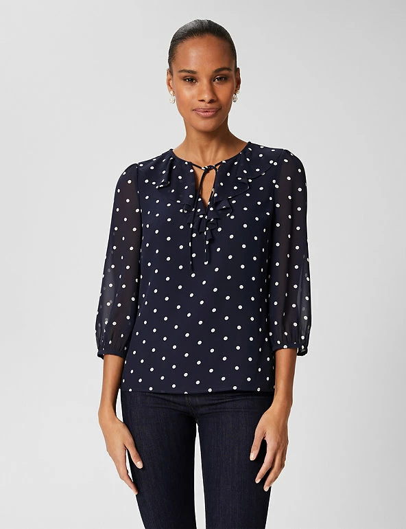 Polka dots bring classic elegance to this pretty blouse from Hobbs. Cut to a regular fit, the sophisticated piece features a chic v-neckline with tie detailing and delicate ruffles for an ultra-modern twist. It’s finished with contemporary three-quarter sleeves. Made with recycled polyester.