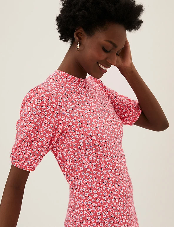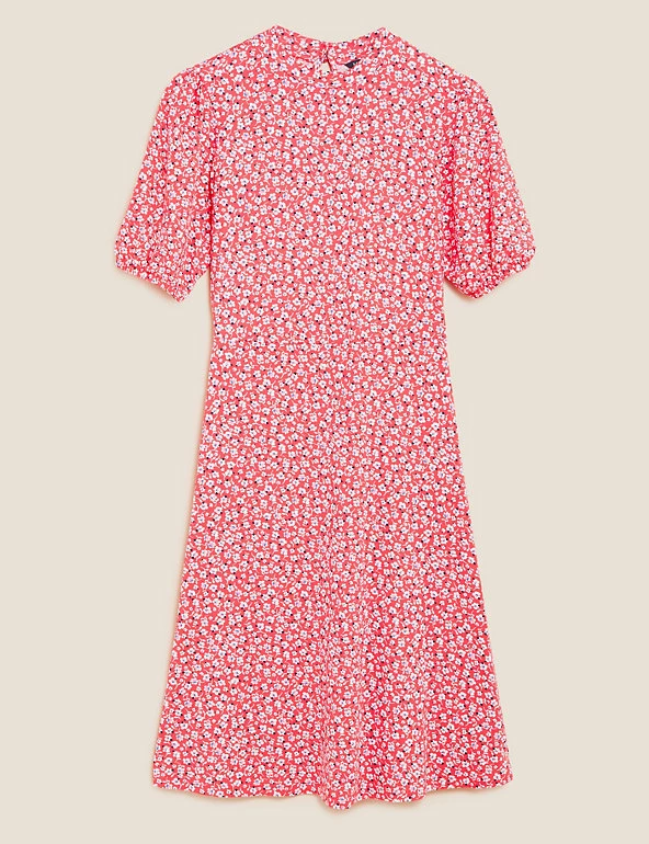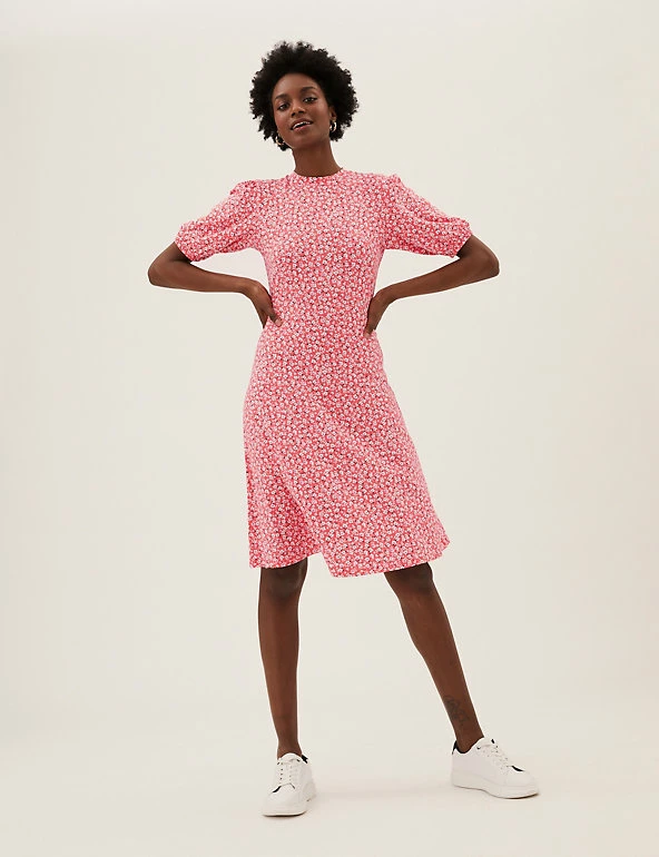 Breeze through warm days in style with this floral print skater dress. This jersey style is cut to a knee length in a regular fit. You’ll stay comfortable all day, thanks to added stretch and elasticated cuffs at the short sleeves. This piece is finished with a covered back button fastening and keyhole cut. Made with sustainably sourced viscose.