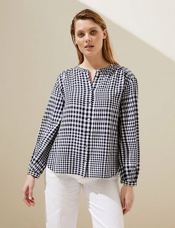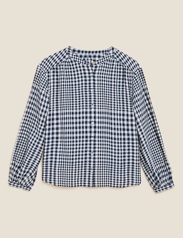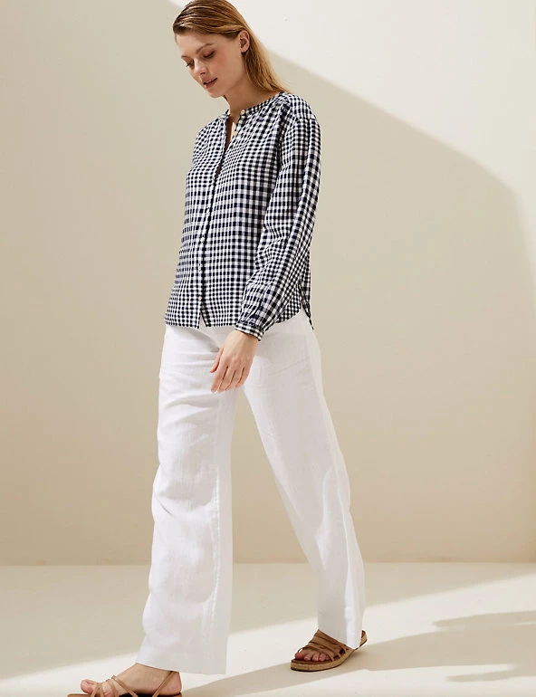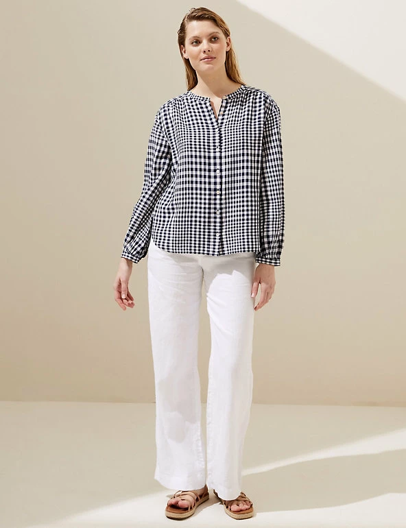 A contrasting checked pattern gives this linen-blend blouse a stand-out look. Regular fit, with long sleeves and a clean collarless finish. Made with sustainably sourced viscose.