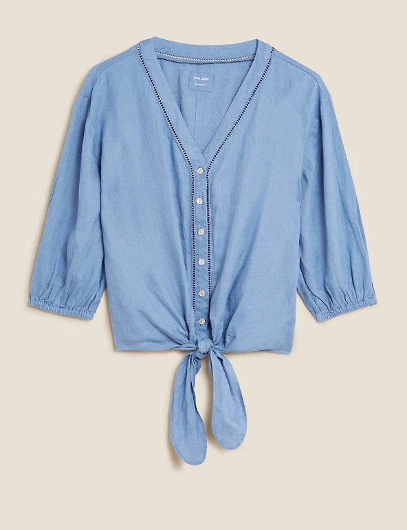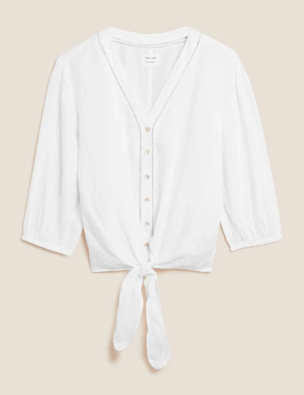 This lightweight linen blouse will keep you comfortably cool throughout the warmer months. Cut to a regular fit, with a flattering v-neckline and pretty pearlescent buttons. Features ladder lace detailing and a retro-inspired tie at the hem. Three-quarter blouson sleeves add to the breezy feel.