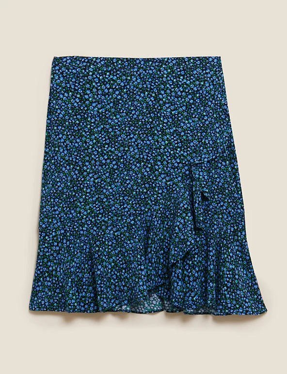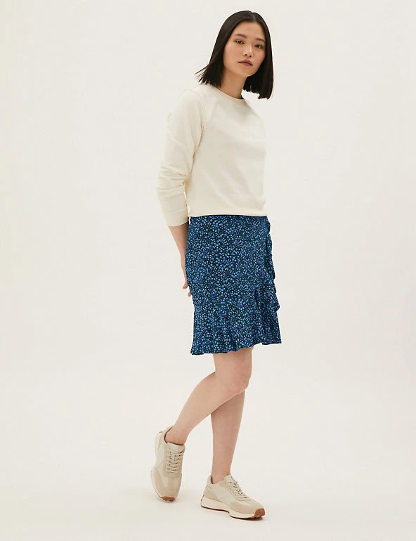 Fresh florals feature throughout this playful mini skirt. It’s cut to a flattering regular fit and sits high on the waist, with a ruffled mock-wrap finish. This piece fastens with a concealed zip at the back. Made with sustainably sourced viscose.