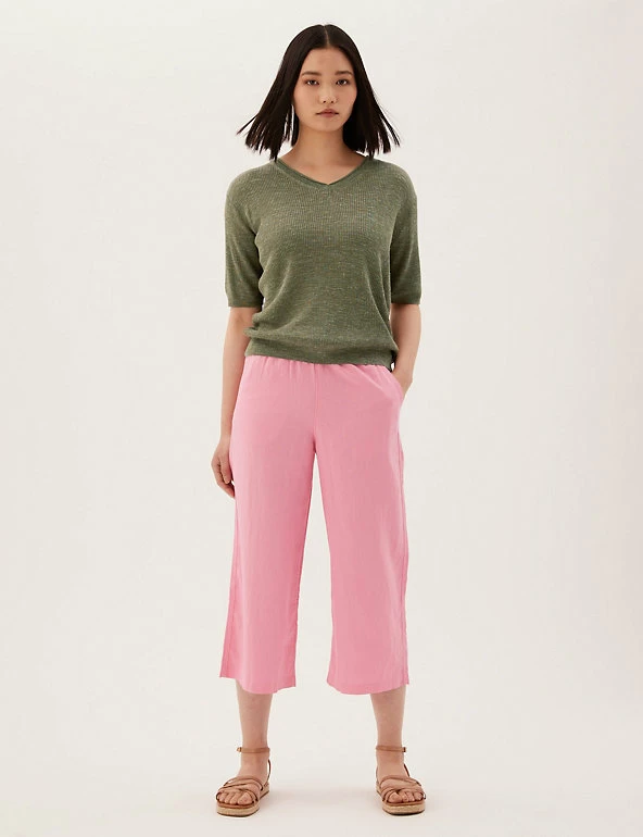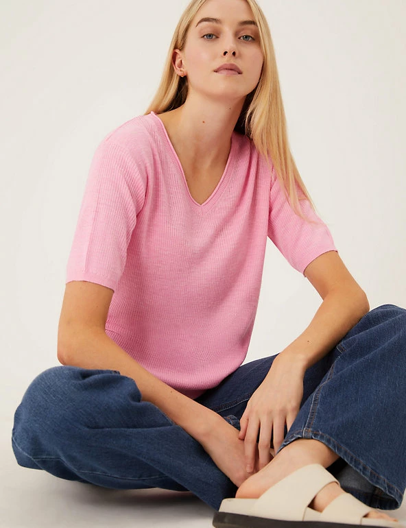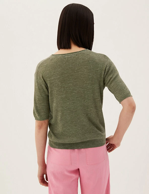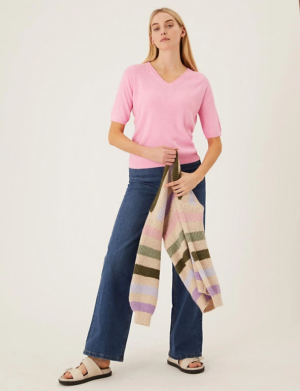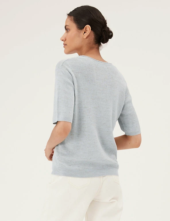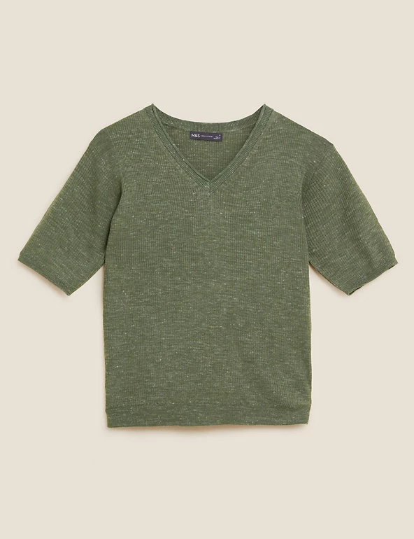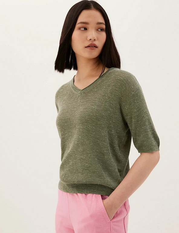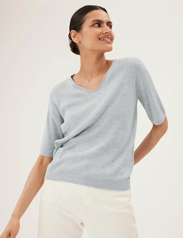 Complete your laid-back look with this v-neck top, knitted with breathable linen. It’s cut in a relaxed fit, with ribbed fabric for a cosy texture. The short sleeves and stretchy hem create a neat finish.