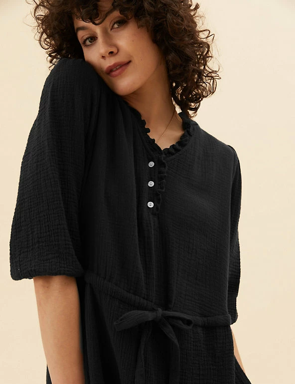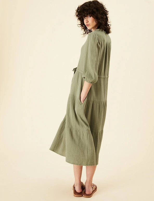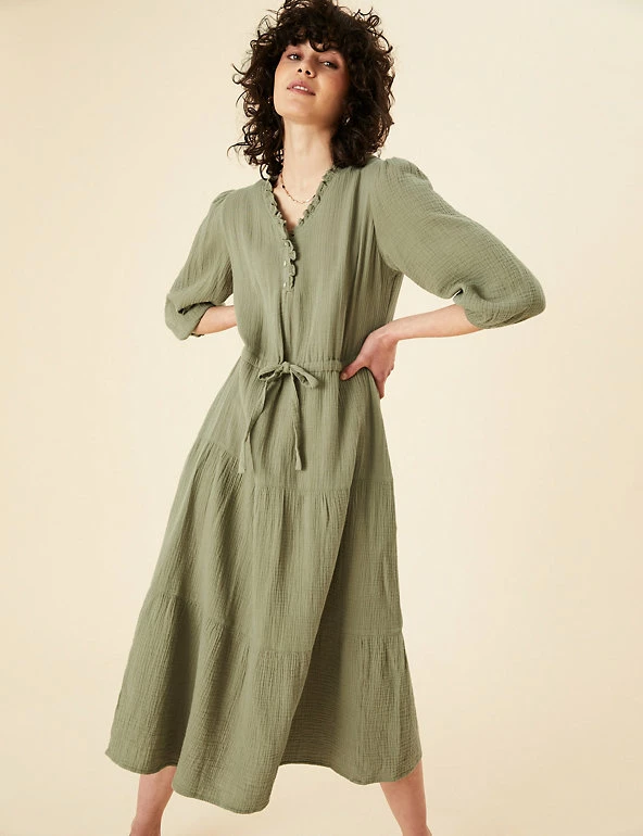 Slip into this pure cotton midi dress from our Per Una collection for a dainty look. It’s cut in a regular fit from textured double-cloth fabric and can be drawn in with the self-tie waist for a flattering fit. We’ve finished the v-neck with a playful frill and added a touch of volume to the half-length sleeves. Button detailing gives a final flourish. We only ever use responsibly sourced cotton for our clothes.