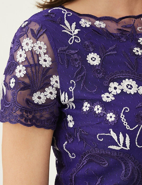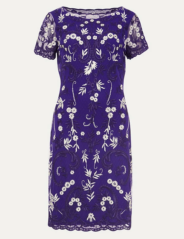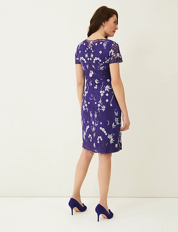 Make a bold impact in this timeless dress by Phase Eight. The elegant knee-length piece is tailored to a regular fit with a flattering slash neckline and full lining. Intricately woven embroidery adorns the top layer, while the delicate scalloped short sleeves and hem finish the look with an extra dose of femininity.