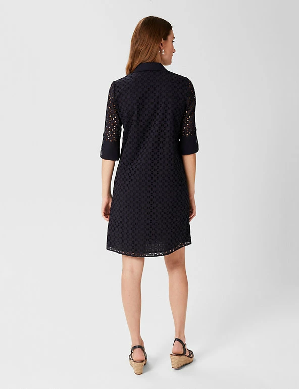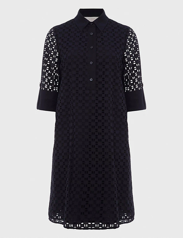 Opt for an elegant look with this pure cotton broderie anglaise shirt dress from Hobbs. It’s designed in a comfy regular fit with a versatile knee-length hem. A buttoned placket and collared neck add a smart look, while three-quarter sleeves with buttoned cuffs provide a flattering finish. It’s lined for comfort. This brand is proud to invest in making cotton production more sustainable.