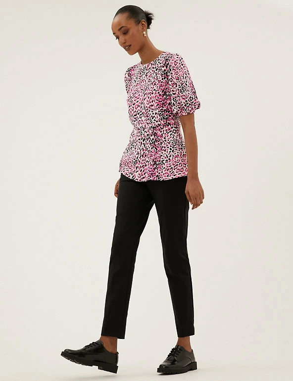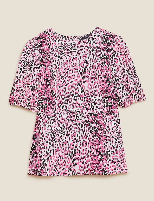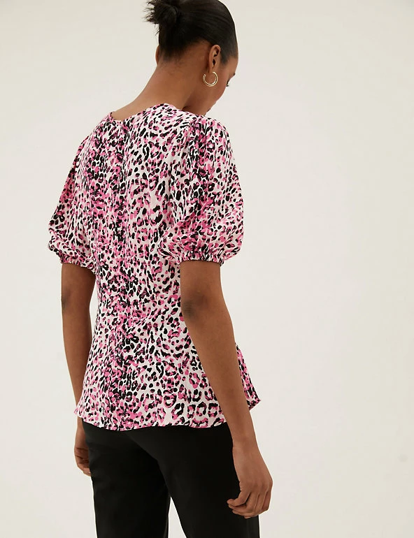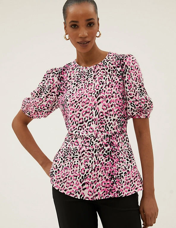 Add a wild touch to your ensemble with this animal print top. Regular fit, with a flattering empire waist and peplum hem for a sophisticated silhouette. Short puff sleeves add a hint of volume.