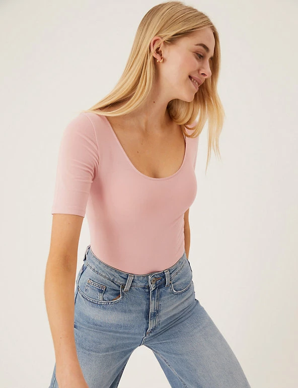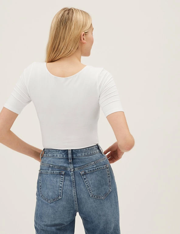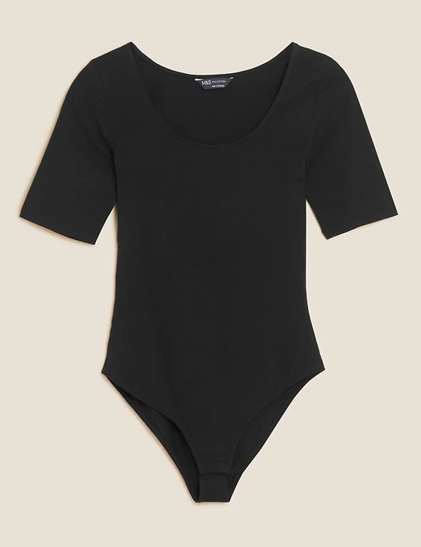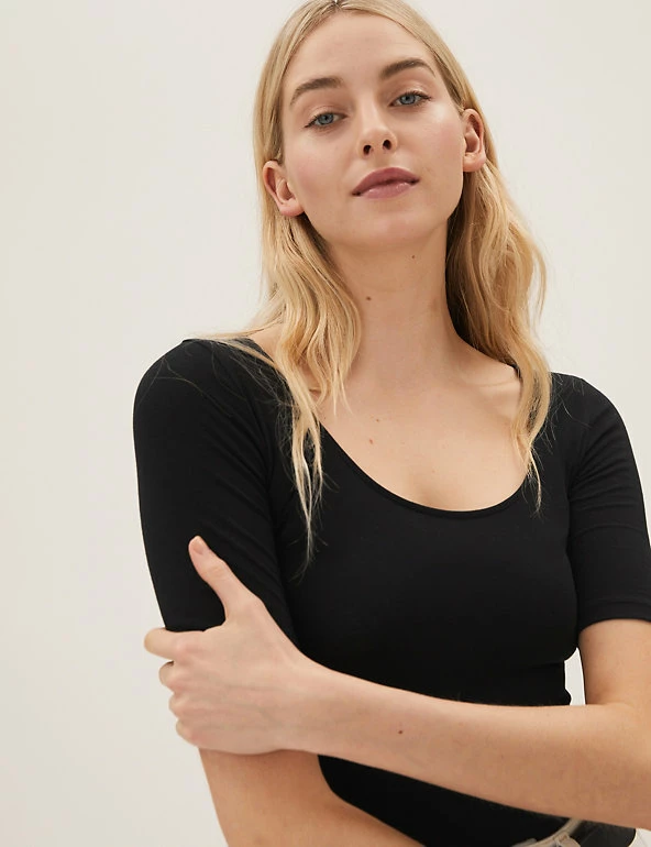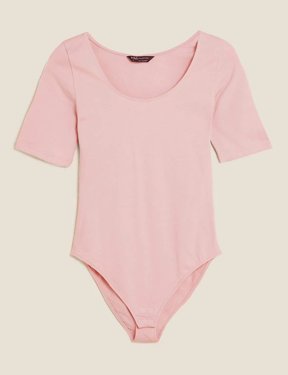 Slip into this soft cotton-rich bodysuit for irresistible comfort. The fitted style has added stretch for personalised shaping. With neat half sleeves and a flattering scoop neck. We only ever use responsibly sourced cotton for our clothes.