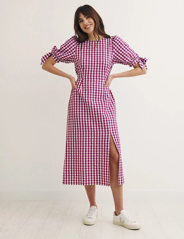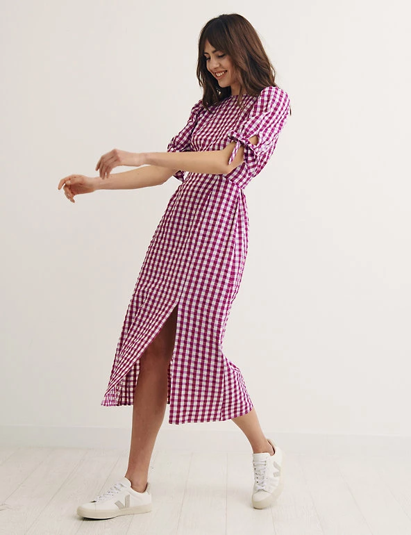 Featuring a cheerful gingham print, this Nobody’s Child tea dress is a timeless option for sunny day plans. It’s designed in a regular fit with a simple round neckline and a shirred back panel for comfort. Tie detail on the short sleeves and a side slit at the bottom add contemporary finishing touches. This piece sits at an on-trend midi length. Made with recycled polyester.