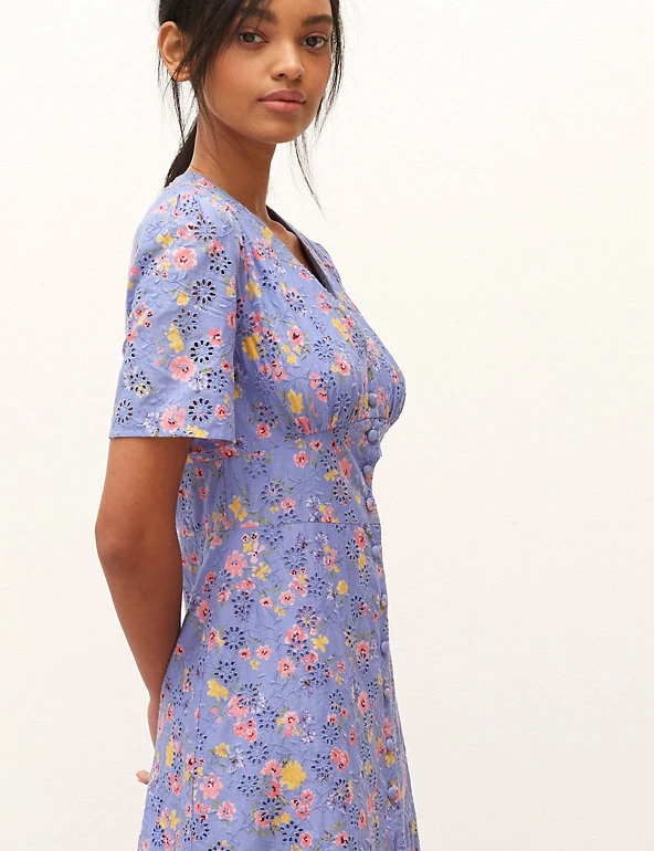 Adorned with a pretty floral print, this pure cotton tea dress from Nobody’s Child makes a contemporary statement. Its fitted design cuts close to the body for a streamlined look. The chic midi-length piece features a flattering v-neck, modern button-through closure and a comfortable full lining. Breezy short sleeves keep you cool all day long.