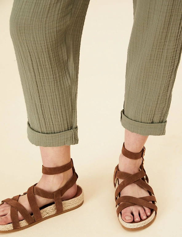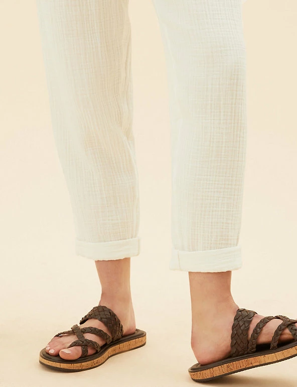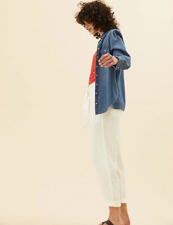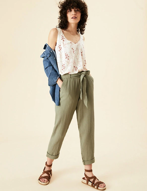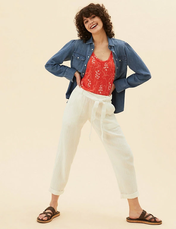 Slip on these pure-cotton Per Una trousers for easy-breezy style on warm days. They come in a tapered fit, with a comfortable elasticated high waist. The hems fall to a cropped length and can be rolled down for more of an ankle-grazer cut. These trousers are made from a comfy textured fabric and there’s also a detachable belt, for an elegant look. All of the cotton for our clothing is sustainably sourced and always will be.