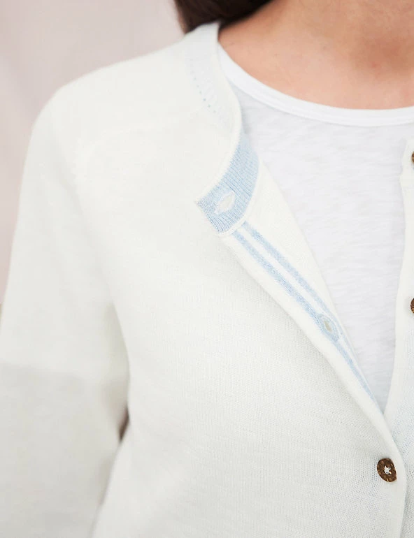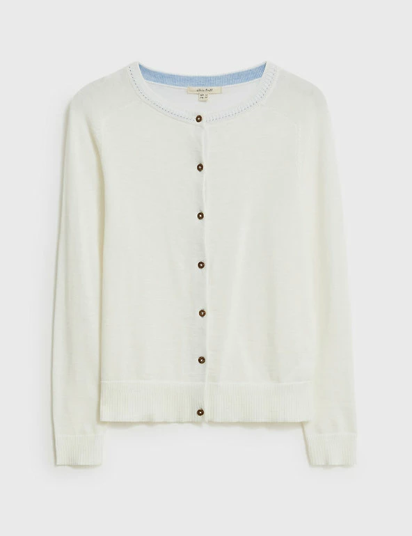 Layers don’t get more versatile than this pure organic cotton White Stuff cardigan. This regular-fit style features a classic crew neck and long sleeves, plus ribbed trims for a fitted feel. It’s finished with contrast button fastenings, and spot stitch detailing along the neck. Made with organic cotton.