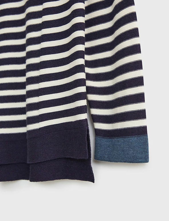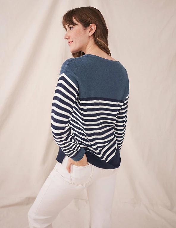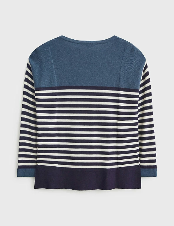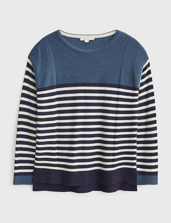 Crafted from a soft cotton blend, this casual jumper by White Stuff is made for laid-back weekends. This regular-fit piece features a nautical-inspired striped design along the front and sleeves. It sports a classic crew neck, elegant long sleeves and side vents for ease of movement.
