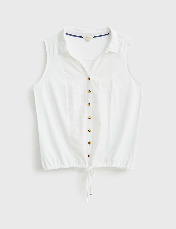 This breezy pure cotton top by White Stuff is the perfect day-out option. The sleeveless style has a regular fit, with a laid-back open collar neckline and button-through front. It’s made with jersey fabric for a casual feel. A tie channel lets you adjust the fit of the hem.