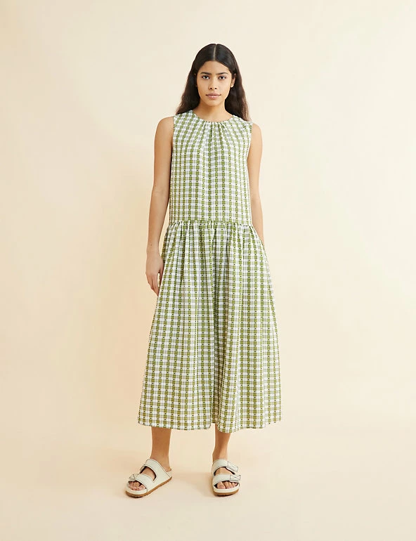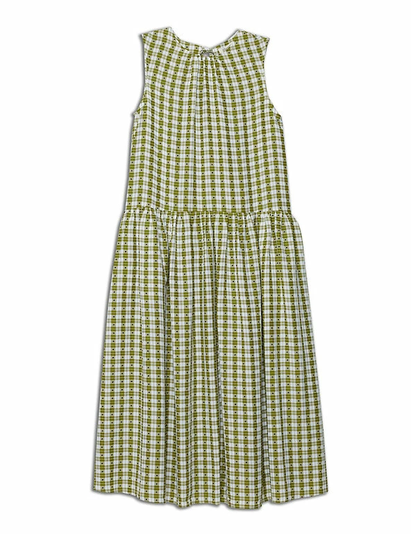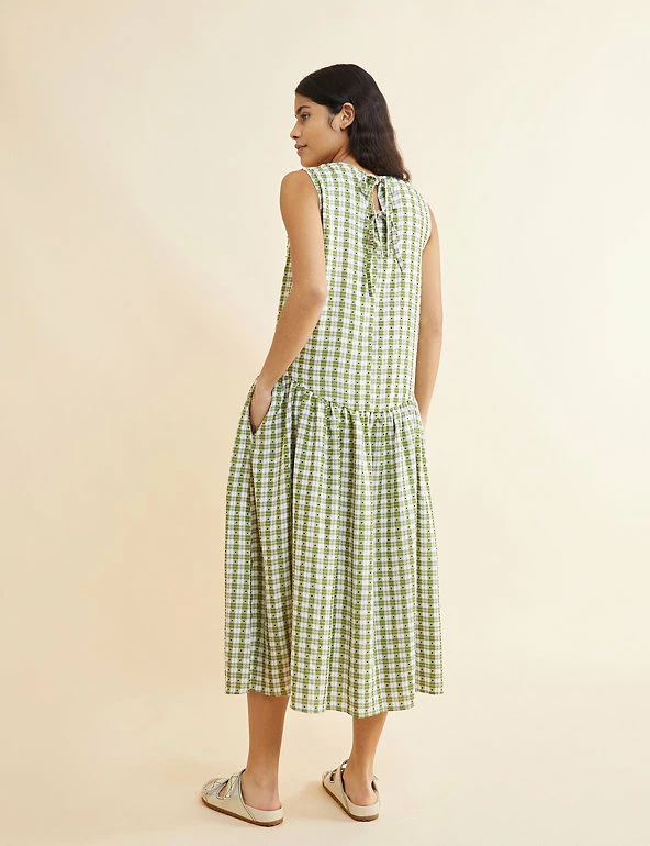 This playful swing dress by Albaray is an easy-breezy style for summer. Designed in a regular fit, this sleeveless midi features a round neck, plus modern drop waist detailing. The classic check pattern is finished with contrast dots, and tie closures at the back add extra interest. Made with sustainably sourced viscose.