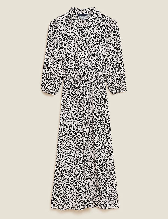 Enliven your everyday wardrobe with this chic animal print shirt dress. It’s cut to a regular fit in a flattering waisted design. It has a classic collared neck and three quarter-length sleeves that are elasticated for comfort. A button-through fastening and on-trend midi hem finish this stylish piece.