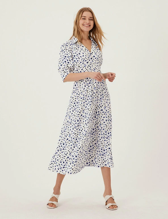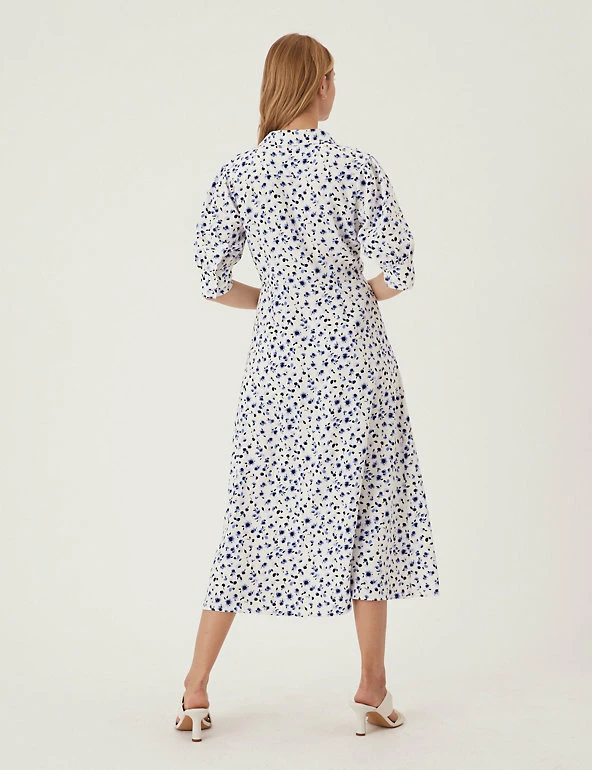 A fresh floral print lends a feminine feel to this elegant midi dress. It’s cut to a regular fit and features a button-through fastening and an open v-neck with a collar for an authentic shirt look. A tie at the waist offers extra shaping.