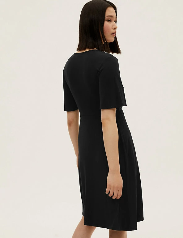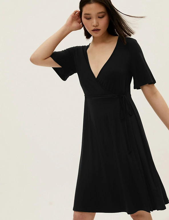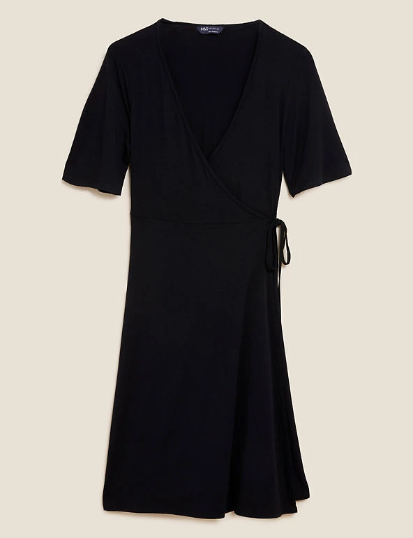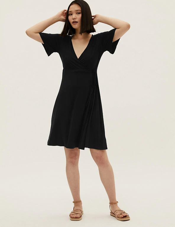 We’ve crafted this wrap dress from lightweight jersey for a breezy feel on balmy days. It has a regular fit and a knee-length hem for easy wear. The tie-front waist is secured at the side for a flattering silhouette, and creates a neat v-neck for a tidy finish. Short fluttery sleeves complete the floaty effect. Made with sustainably sourced viscose.