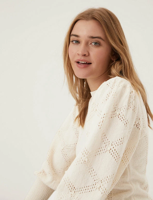 Pull on this cotton-rich jumper for a super snuggly feel. It has a regular fit with textured stripes and criss-crossing shapes on the long blouson sleeves for a cosy effect. Deep ribbed cuffs and a simple crew neck help to lock in heat. We only ever use responsibly sourced cotton for our clothes.