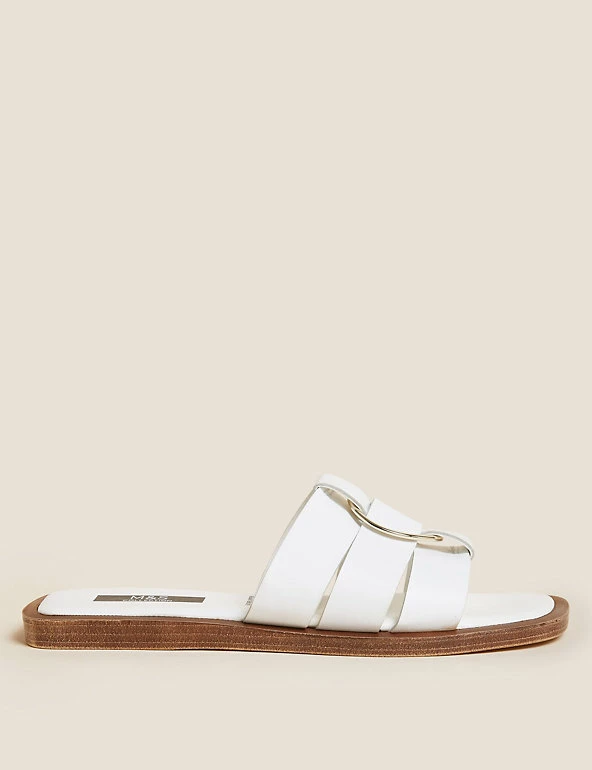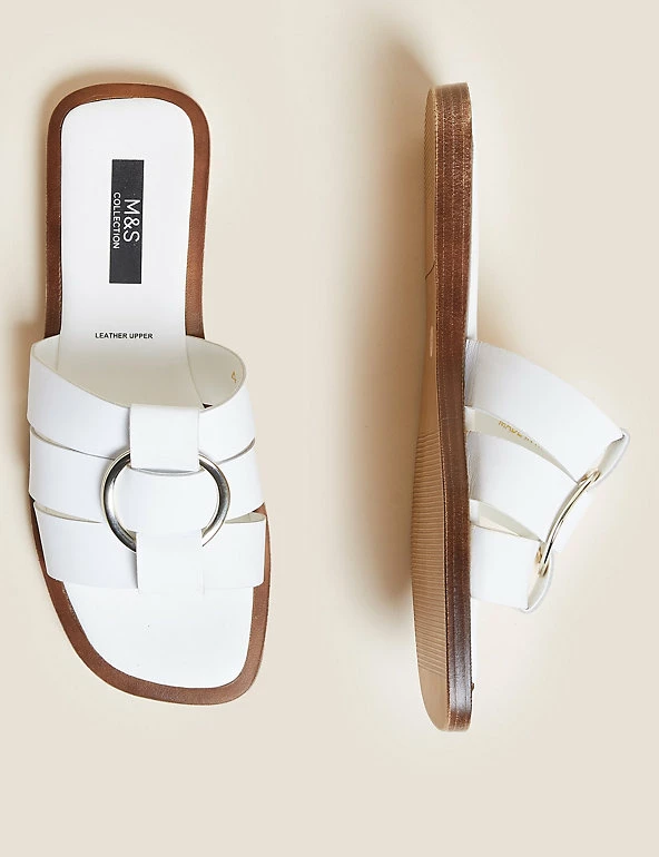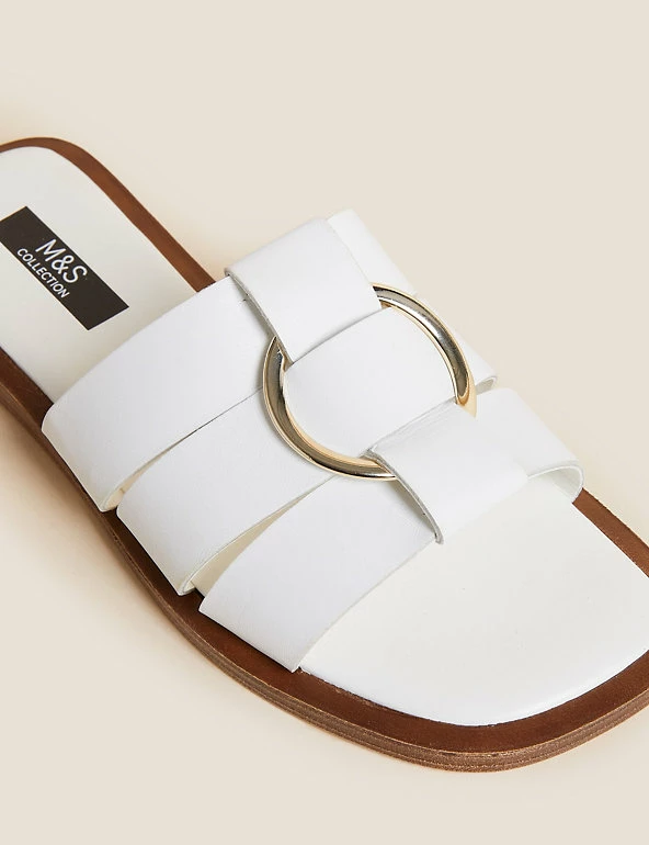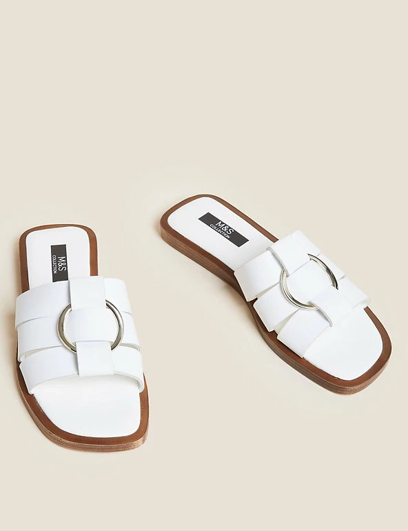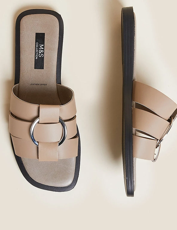Complete a contemporary ensemble with these leather sliders. They’re crafted with a supple strap and shining ring detail over the foot.