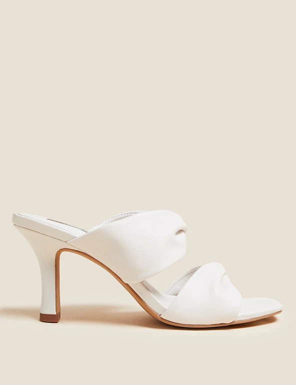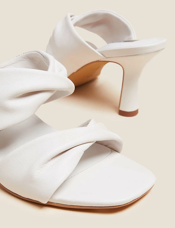 Slip on these leather mules for a striking effect. They have a wide fit and a mid stiletto heel for height, as well as two twist-effect straps across your feet for a stand-out knotted look.