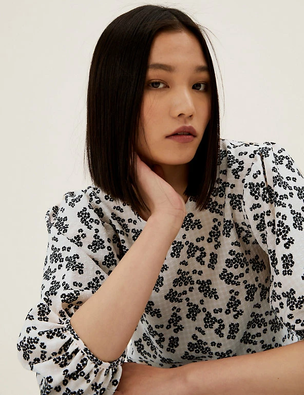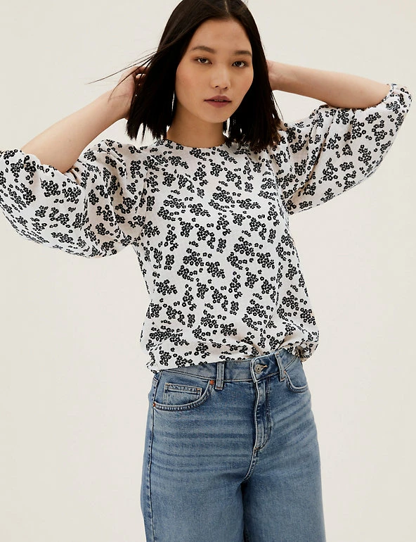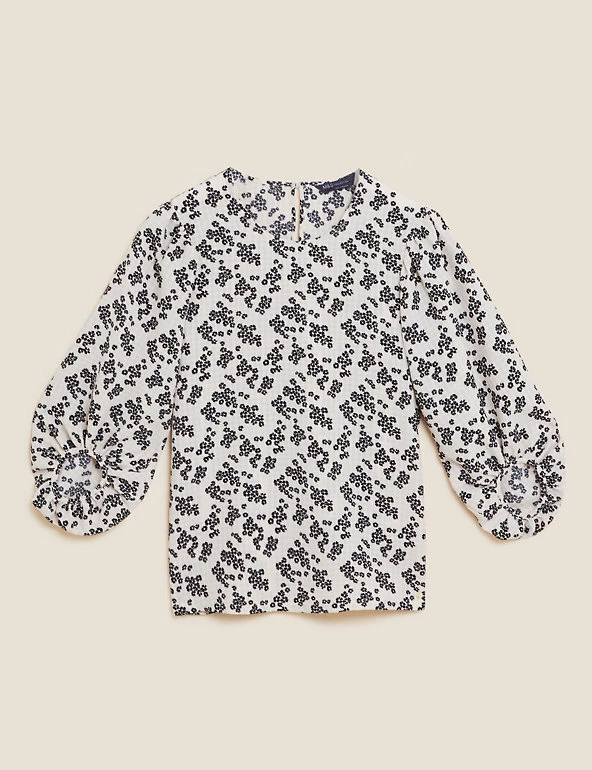 Bring elegance to your ensemble with this floral top. Regular fit, with added stretch for easy wear. The 3/4 length sleeves in an oversized blouson shape create a striking silhouette.