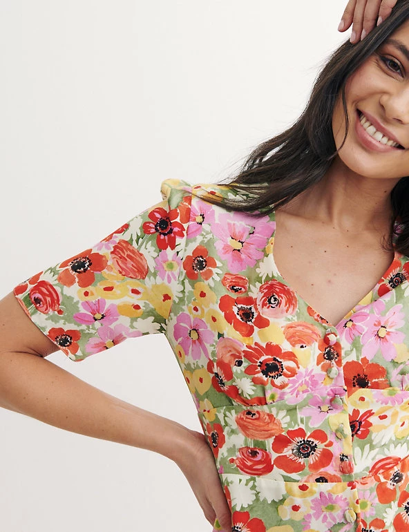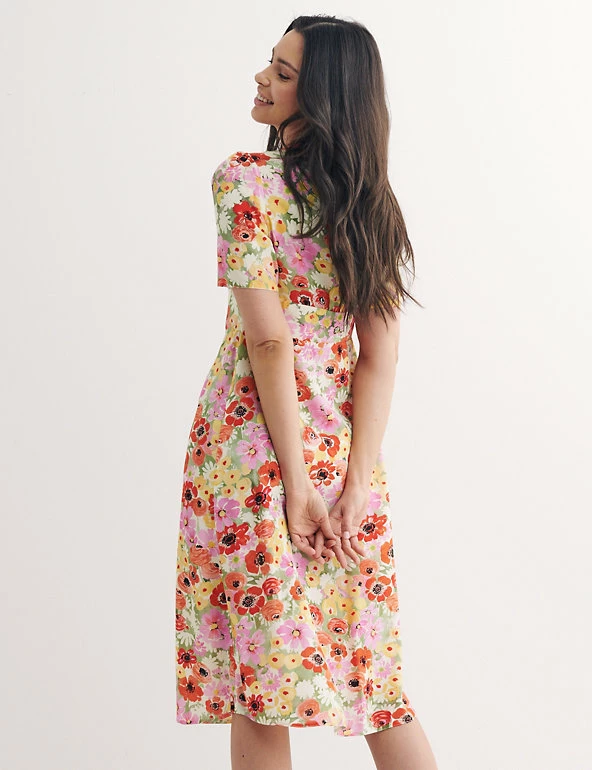 Decorated with artistic florals, this Nobody’s Child tea dress is an instant outfit. It has a fitted cut with a waisted panel to highlight your silhouette and a flattering v-neckline. The short sleeves will have you ready for sunny days. This piece is finished with a button-through fastening and falls to an on-trend midi length. Made with sustainably sourced viscose. Nobody’s Child designs are cut to a form-fitting shape, so if you’re looking for a more regular fit, we recommend choosing the next size up.