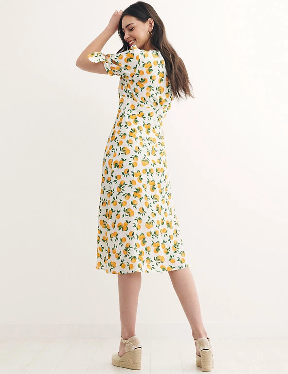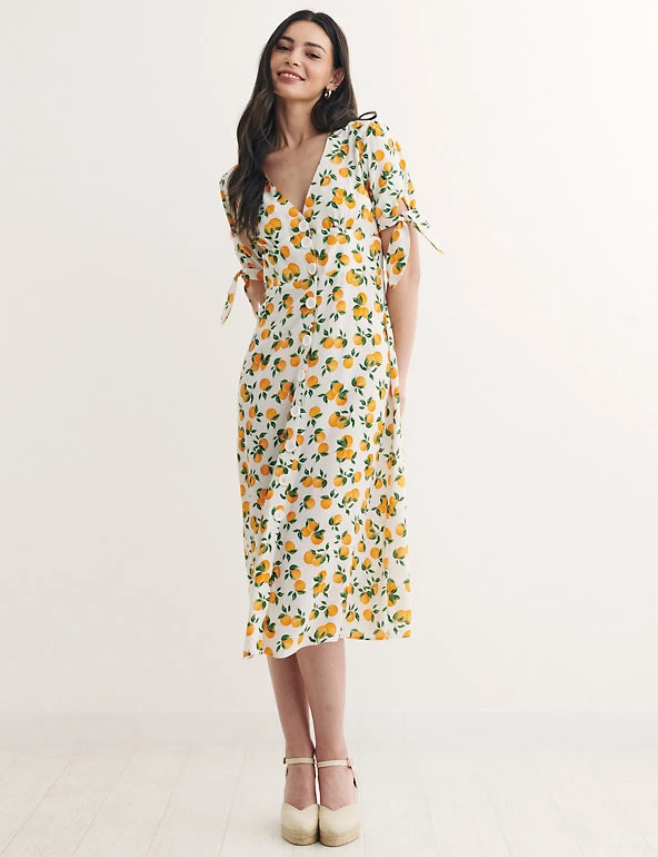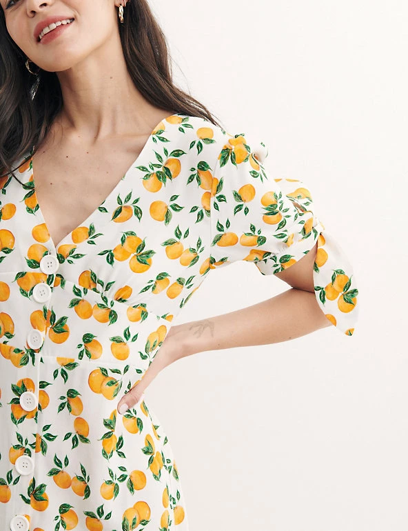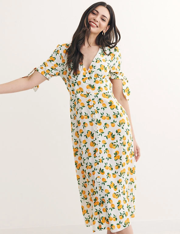 Put a fruity spin on your party look with this eye-catching orange print tea dress by Nobody’s Child. This midi-length piece is fitted and features a waisted panel for a flattering and streamlined silhouette. A sharp v-neck, contemporary button-through closure and breezy short sleeves complete the look. Made with sustainably sourced viscose. Nobody’s Child designs are cut to a form-fitting shape, so if you’re looking for a more relaxed fit, we recommend choosing the next size up.