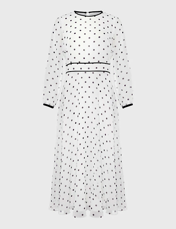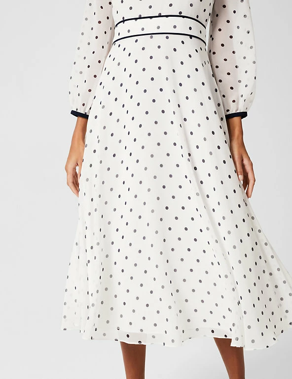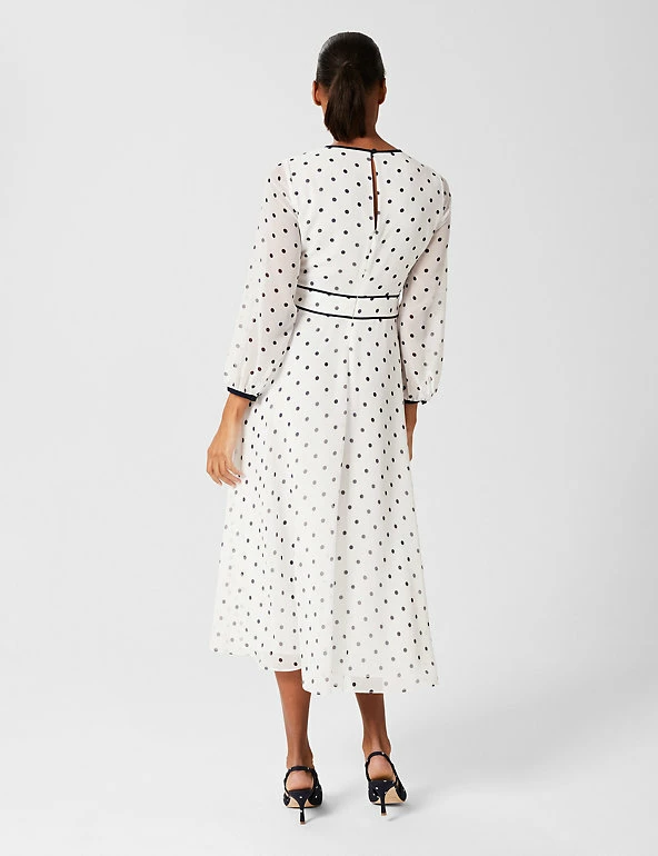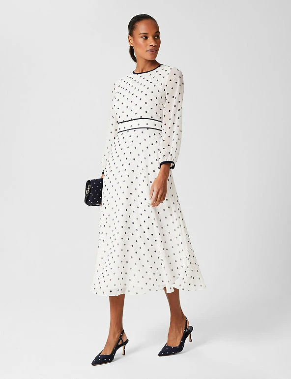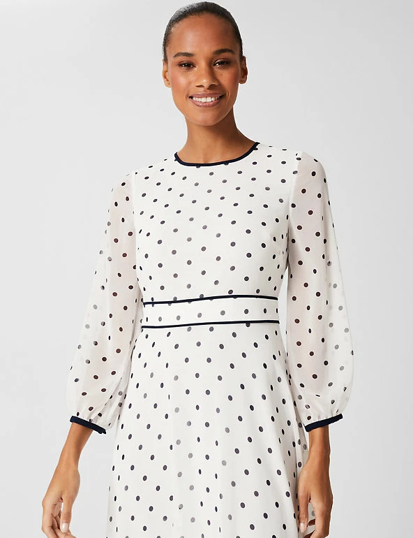 Feel smart and polished on formal occasions, in this flowing polka dot dress from Hobbs. It’s cut in a comfortable regular fit, with a flattering waisted silhouette. Piped trims at the neck and waistline add extra detail, and the three-quarter sleeves are gathered at the cuffs for a touch of fullness. The midi length hem ensures an elegant air. This dress fastens with a back zip.