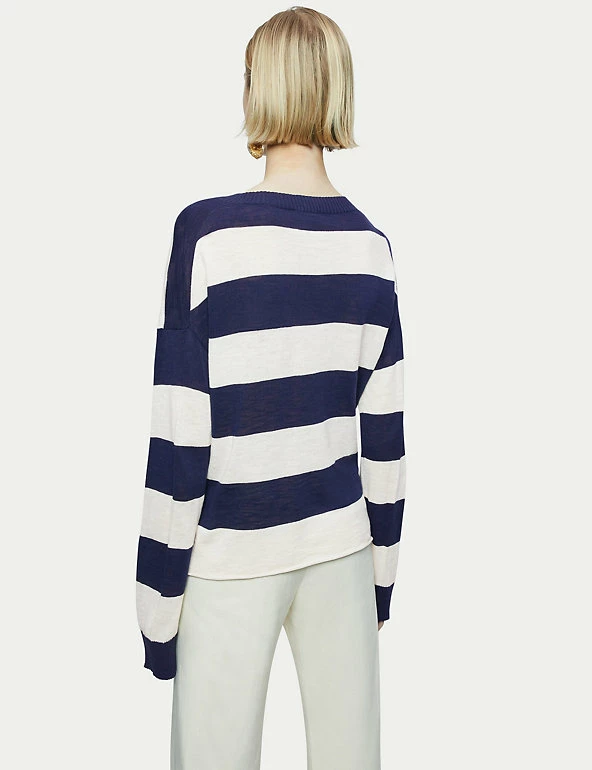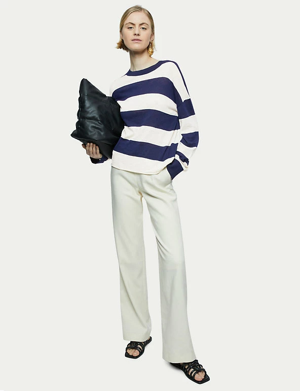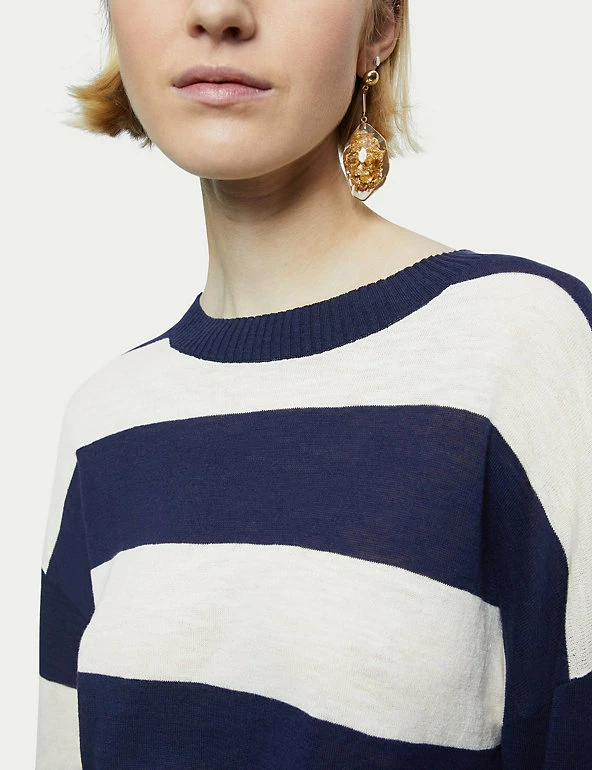 Channel a pared-back look on casual days with this cotton-rich jumper by Jigsaw. Designed in a contemporary oversized fit, this striking piece sports an all-over stripe print. The fine-gauge knit is crafted with a touch of linen for a lightweight feel. It has a classic crew neck, long sleeves and ribbed detail on the neckline and cuffs.