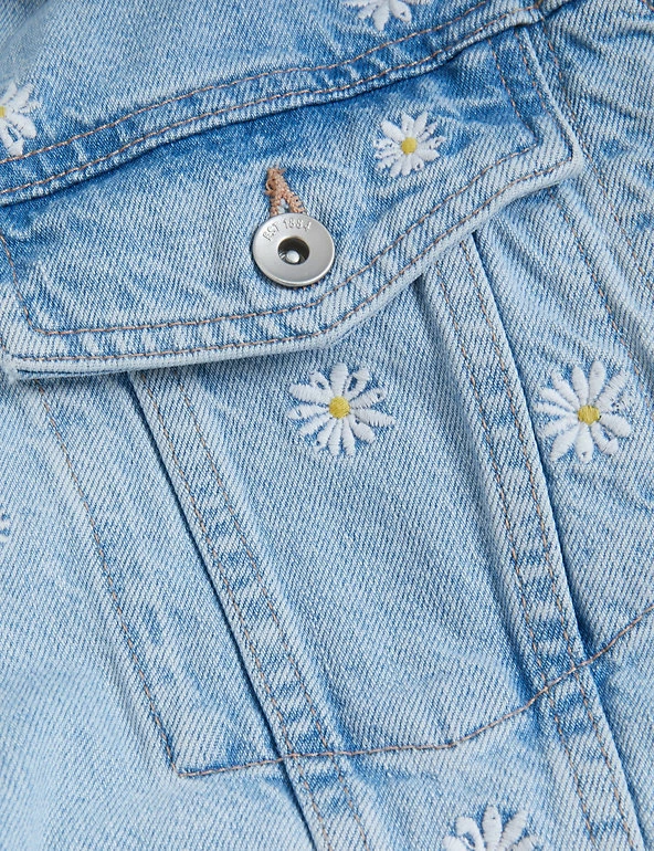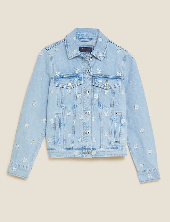 This pure cotton denim jacket is scattered with embroidered flowers for a playful pop. It has a regular fit, with a button fastening leading down from the smart collar. Pockets inside and out are ideal for storing essentials. The cuff opening and shining silver hardware offer the final flourish. All M&S denim is made with sustainably sourced cotton and less water.