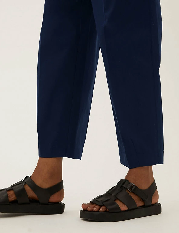 Pull on these cotton-rich trousers for a flattering silhouette. They have tapered barrel legs with an ankle-grazer length and darts in the front and back for added shaping. Practical side pockets and a mock back pocket for added detail. Secure zip fastening at the side of the high waist. We only ever use responsibly sourced cotton for our clothes.