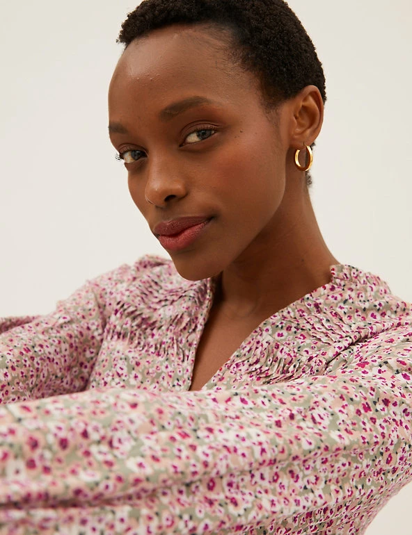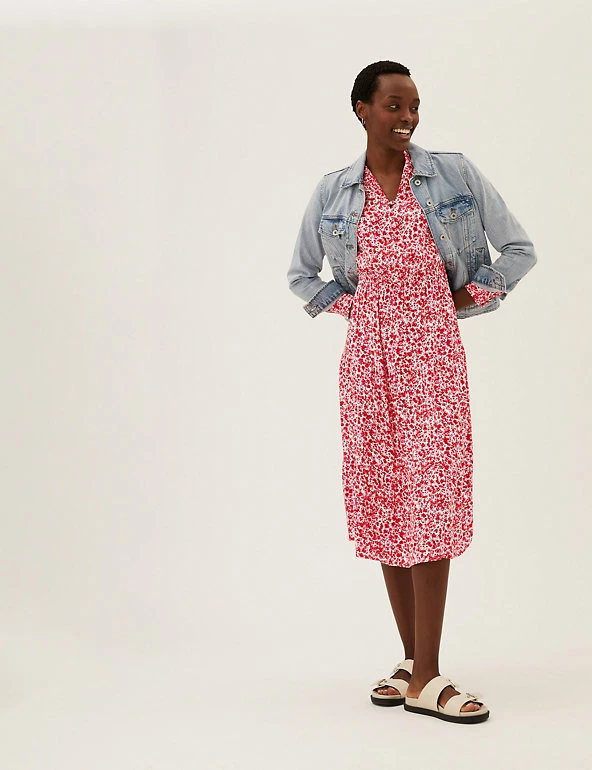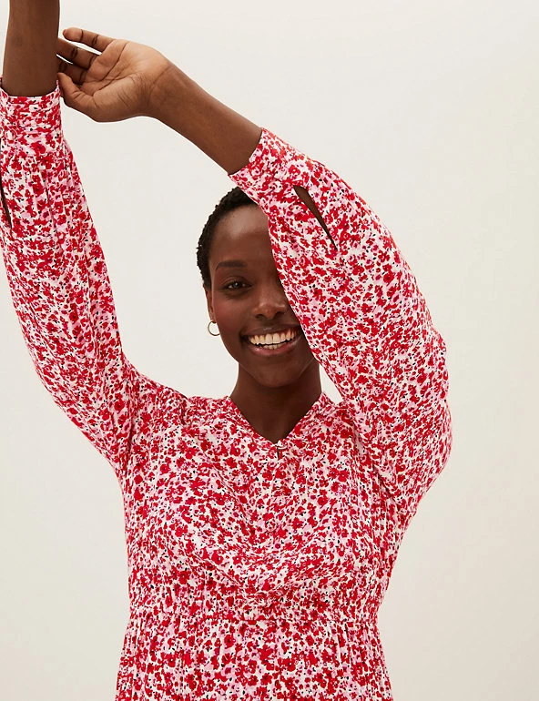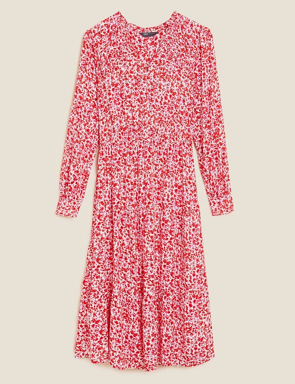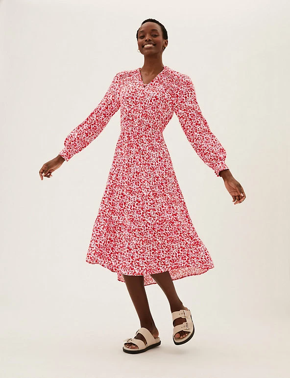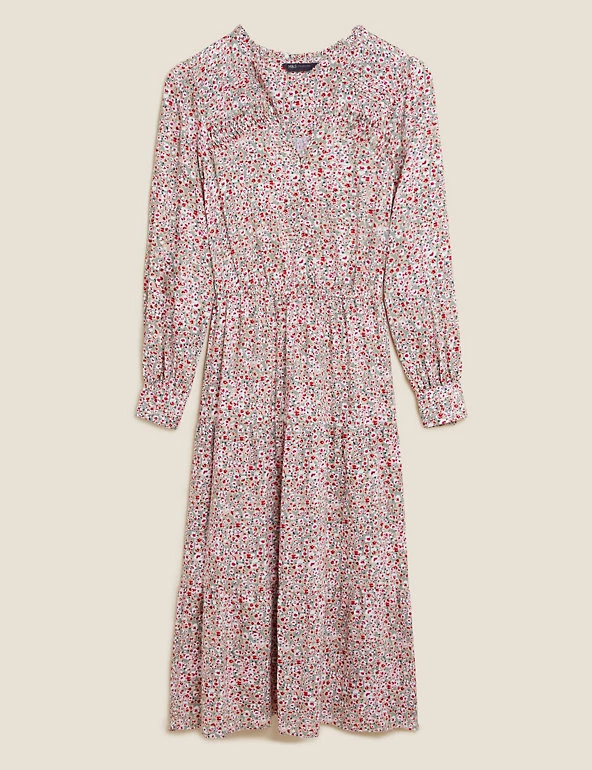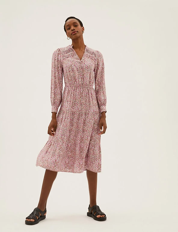 Bright ditsy flowers feature all over this midi dress for a spritz of springtime. It it crafted in a regular fit, with pintuck detailing and an elasticated waist for a sophisticated silhouette. Long blouson sleeves add a hint of volume, while tiers in the skirt accentuate the elegant effect. Covered buttons run down from the v-neck for a neat finish.