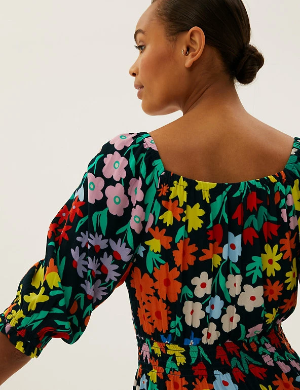 A brightly coloured floral print gives this midi dress a summer-ready look. It has a regular fit with a shirred waist for a flattering silhouette. Three quarter-length puff sleeves with ruffle cuffs add a touch of volume. The squared notch neck is elasticated with a self-tie cord at the front for added detail. Made with sustainably sourced viscose.