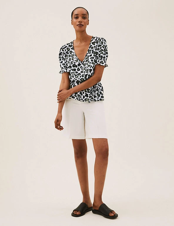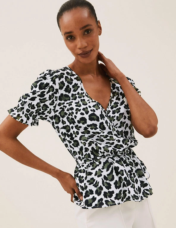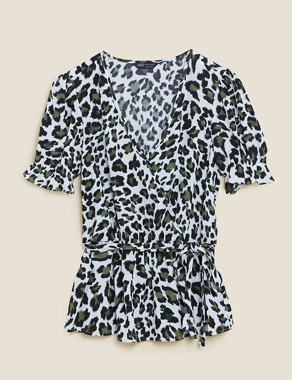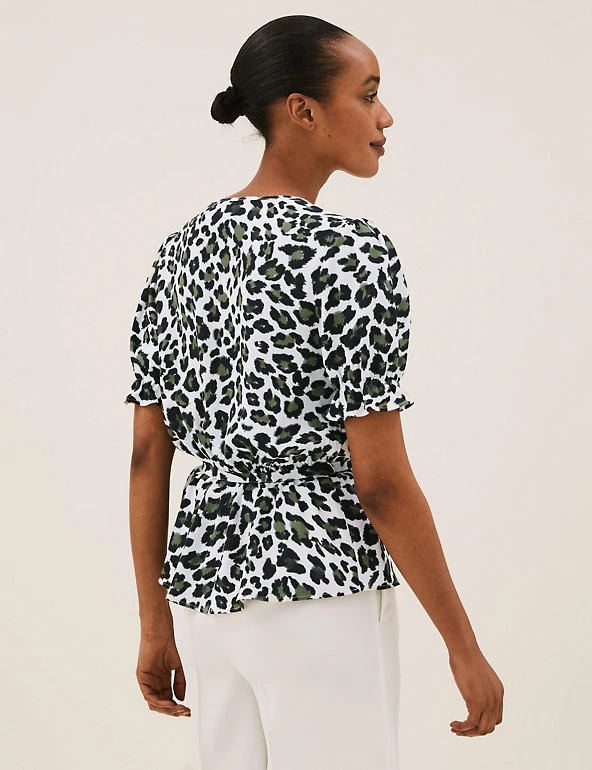 A wild animal print gives this wrap-effect top a bold look. It’s cut in a regular fit, with a self-tie waist and v-neck for a flattering fit. Short puff sleeves add a touch of volume.