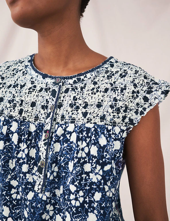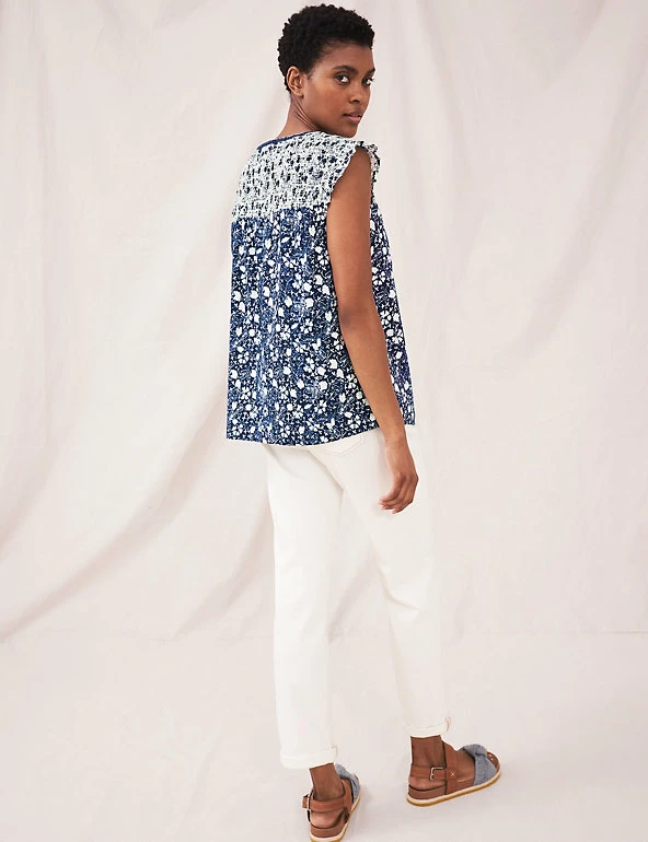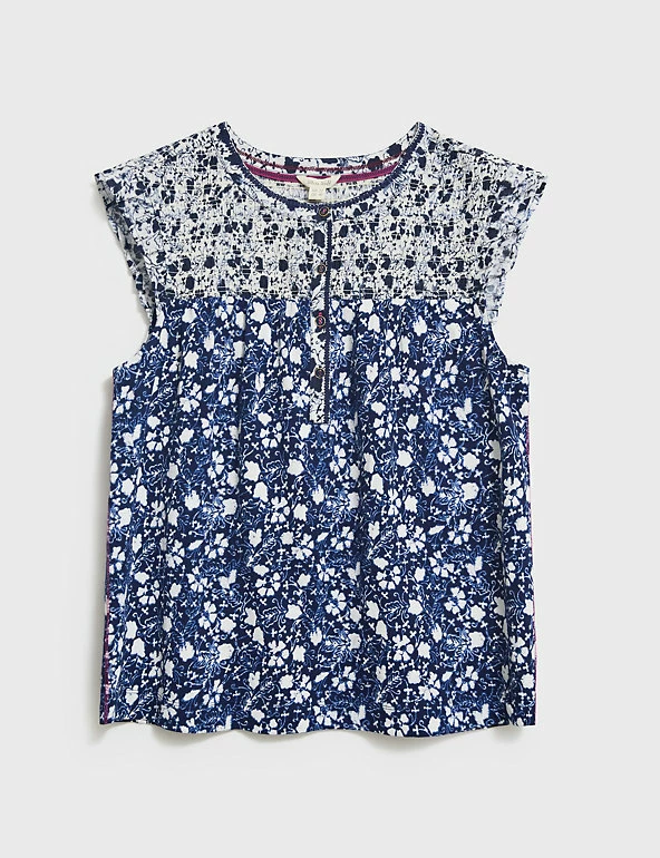 Stay cool in the sunshine with this pure cotton vest top from White Stuff. This classic sleeveless design is cut to an easy regular fit and features a casual round neck. Shirred detail on the top half allows you to move with ease and adds texture. It also has a contrasting floral print to the bottom half for an eye-catching look. A button fastening provides the finishing touch.